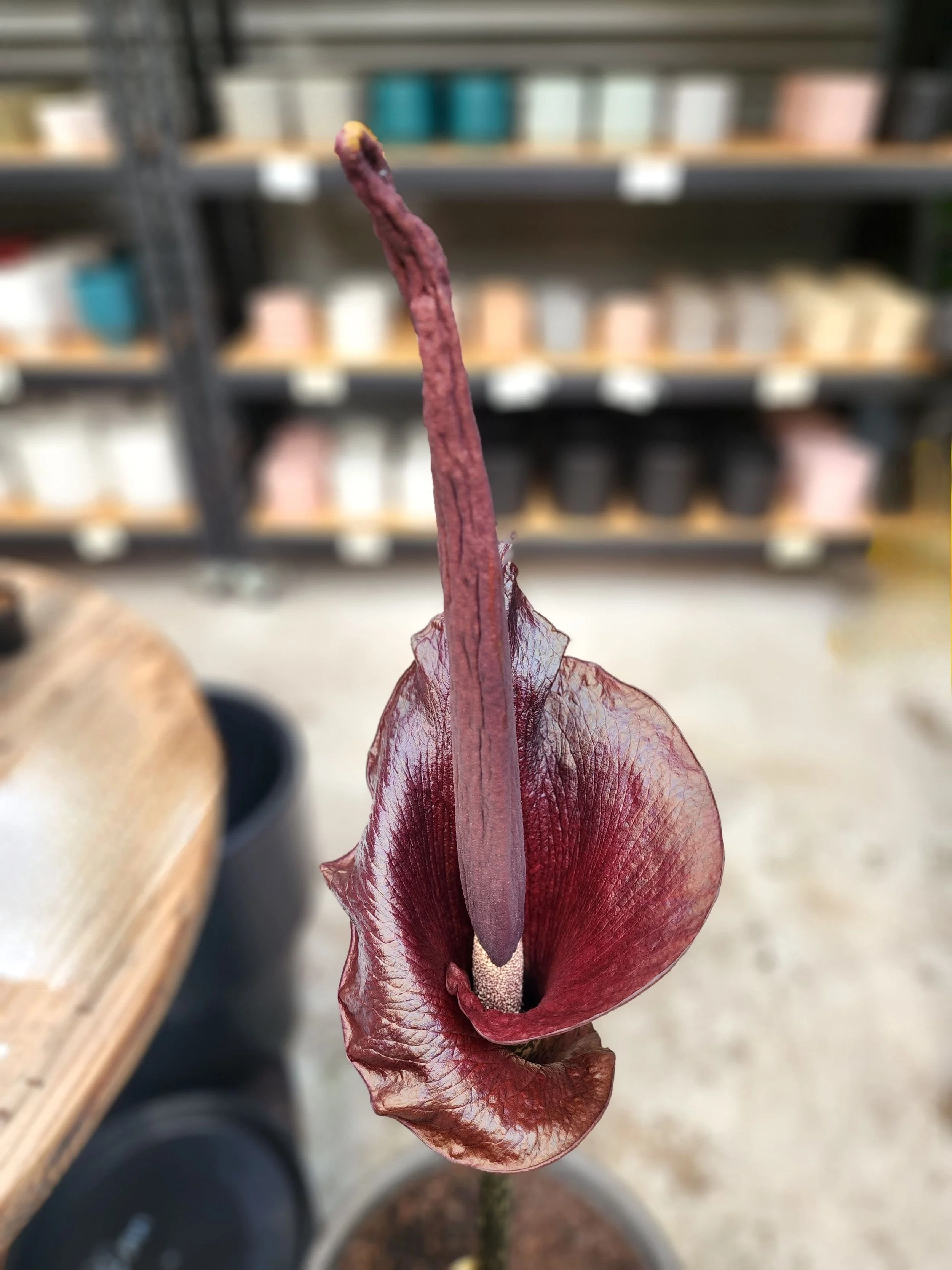 The Amorphophallus Konjac 'Voodoo Lily' is a rare bulb plant that roots and grows in the warmer months of the year. In Autumn it will die back and become dormant until the next season and the stem can be cut off if it doesn’t fall by itself. It is expected that the root system will disappear when dormant and regrow each Spring. Once it reaches mature bulb size, it will grow a deep burgundy flower spike in warmer months, well known for its pungent odour. It also proliferates bulbs meaning you can have multiple plants over time. This is a rare and special plant that is not often available. The Konjac likes a bright position and damp but not wet and boggy soil and can be left mostly dry through Winter after the spike has died off. Begin dampening the soil again in Spring to encourage growth. This plant is propagated and grown by Verdant Dwellings.