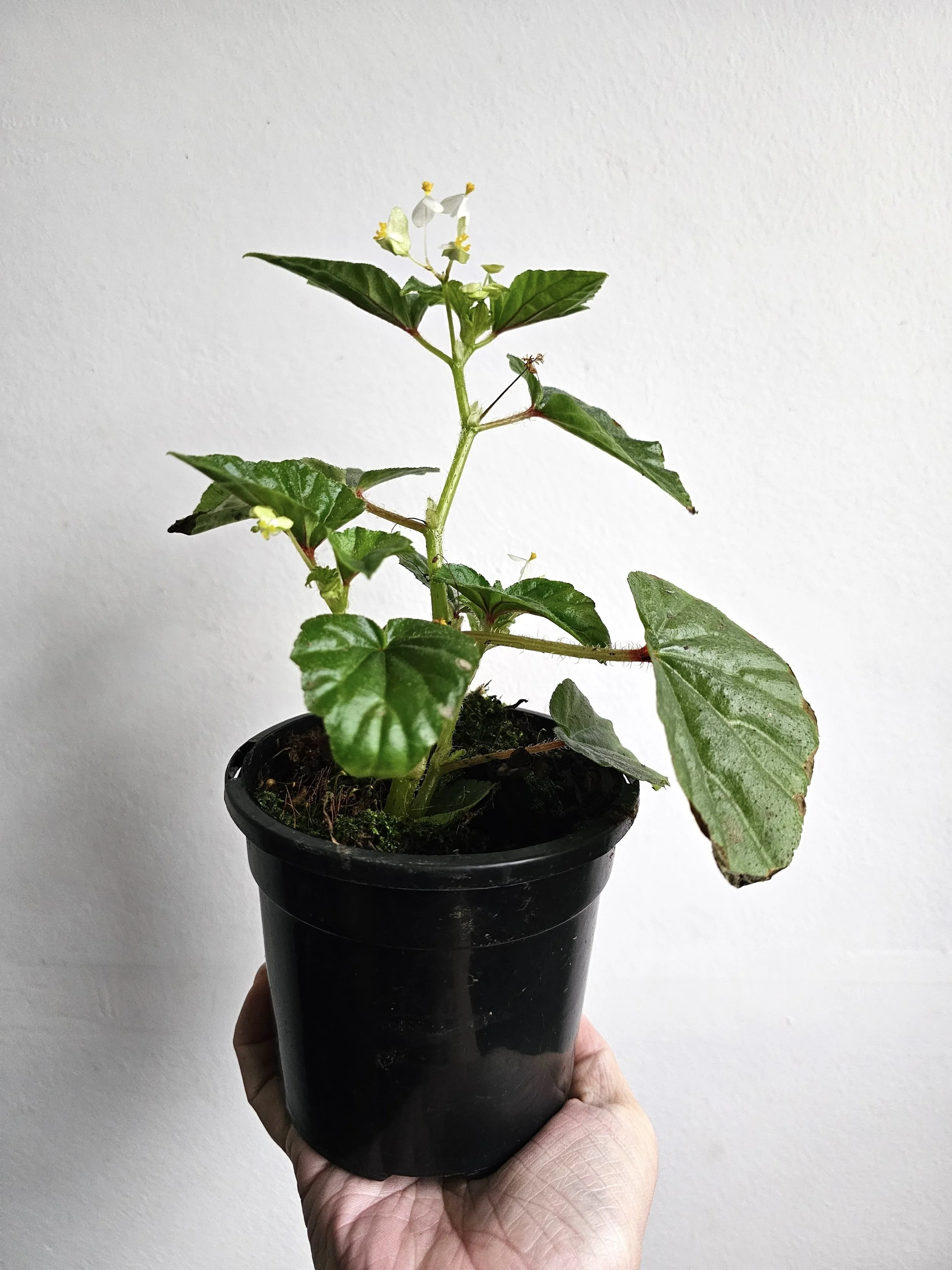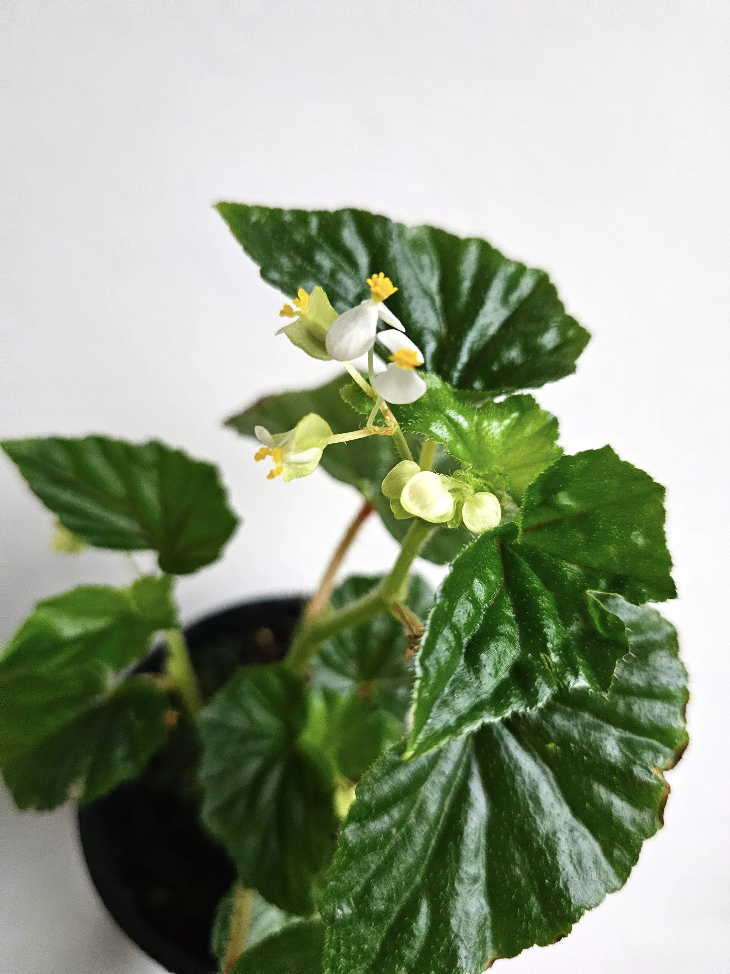 The Begonia Baby Wings White is a bushy Begonia that has bright green glossy drop-shaped leaves. Smaller in size than cane Begonia leaves, the stem of each leaf has a blush colour to it. This variety also produces small white flowers with a yellow centre. It needs a very brightly lit position out of harsh sunlight and does not want to be cold. Begonia need their soil to stay slightly moist but never wet, and do not like to have water sitting on their leaves as it can cause mould and rotting to occur. This plant is Propagated and Grown by Verdant Dwellings.