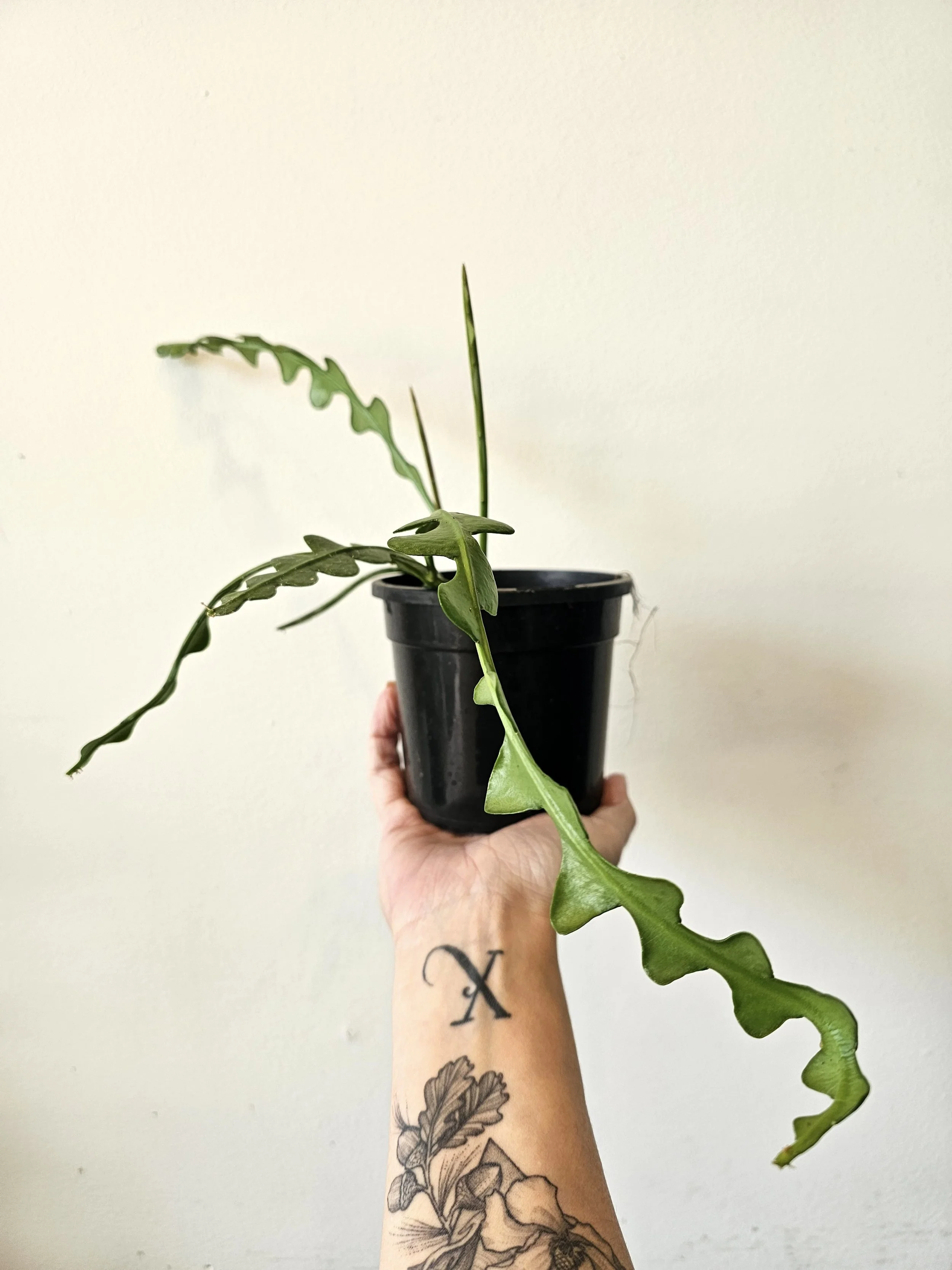 The Epiphyllum Anguliger or ‘Fishbone Cactus’ is from the cactus family and is similar in look to other flat leaf Epiphyllum. It grows long flat foliage that also acts as a stem and will branch continuously growing bushier and trailing downwards, however, this variety also has a ‘zig zag’ or fishbone shape to every leaf, giving the plant its common name. It flowers when mature, which can take some time, with a beautiful orange and white fragrant flower that blooms at night similar to its cousin the Epiphyllum Oxypetalum. It likes a morning sun or bright indirect light position and not to dry out completely. Although it is part of the Cactus family, it does not like to be dry or be in full harsh sun and leaves will appear yellowish if the position is too bright and shrivel if too dry. This plant is Propagated and Grown by Verdant Dwellings.