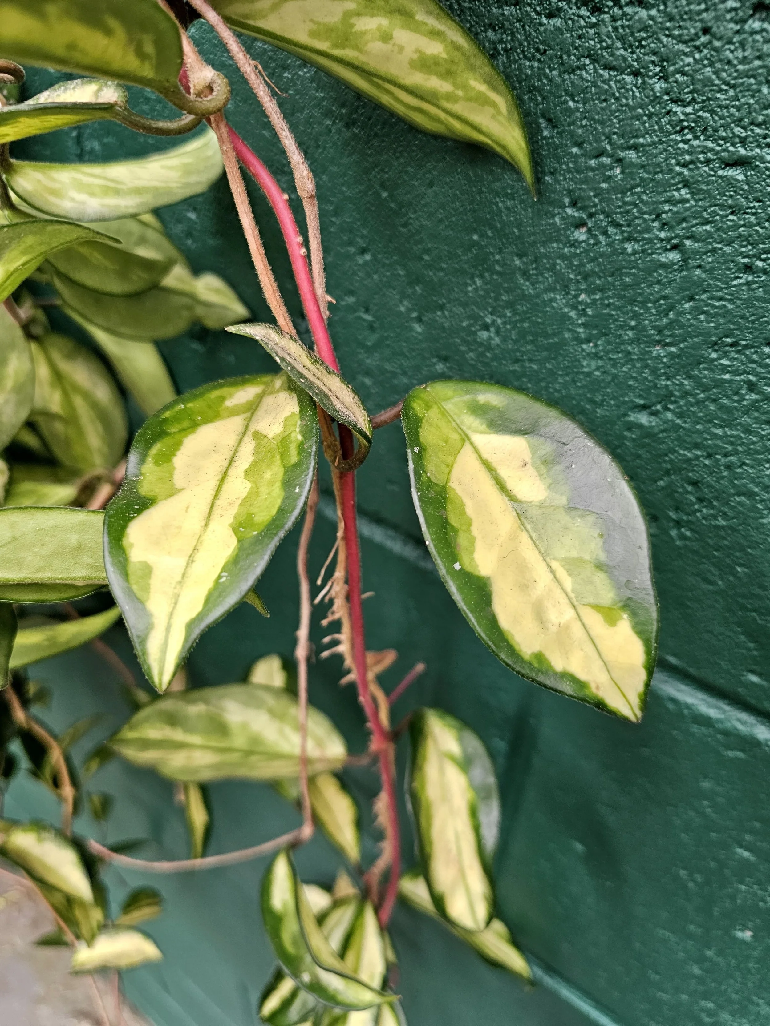 The Hoya Krimson Princess is a hardy and fast growing plant with variegated deep green, thick and waxy leaves with light green and cream variegation with pink stems on new growth. It can trail down but will easily climb any structure near it. It sends out long climbing vines that will eventually develop leaves as the plant grows. It likes a bright light position and can dry out between waters. In the cooler months, it can be left without water for longer periods.
