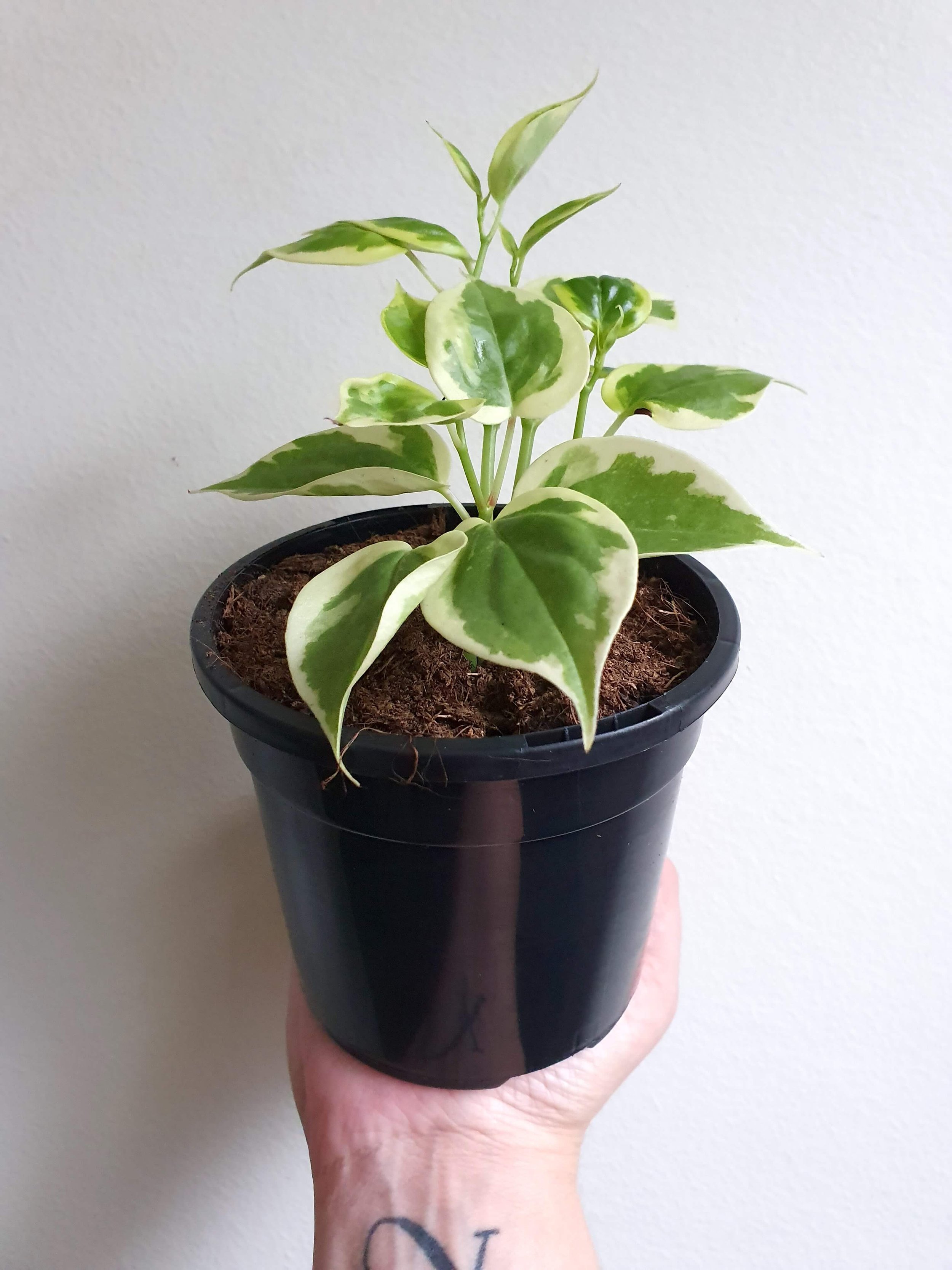 The Peperomia Scandens Variegata is a pale green and cream leaved plant that will to the sides of the pot then trail. This plant, like all Peperomia, like to stay moist but not wet in the soil and need a bright indirect position to thrive. This plant is propagated and grown by Verdant Dwellings.