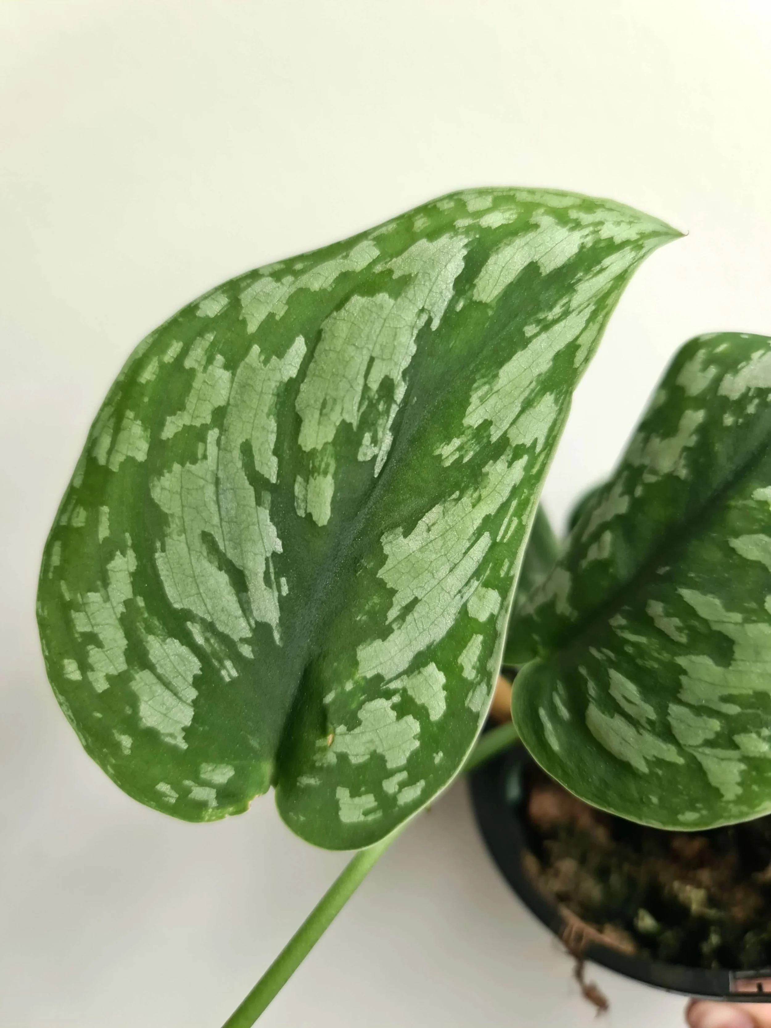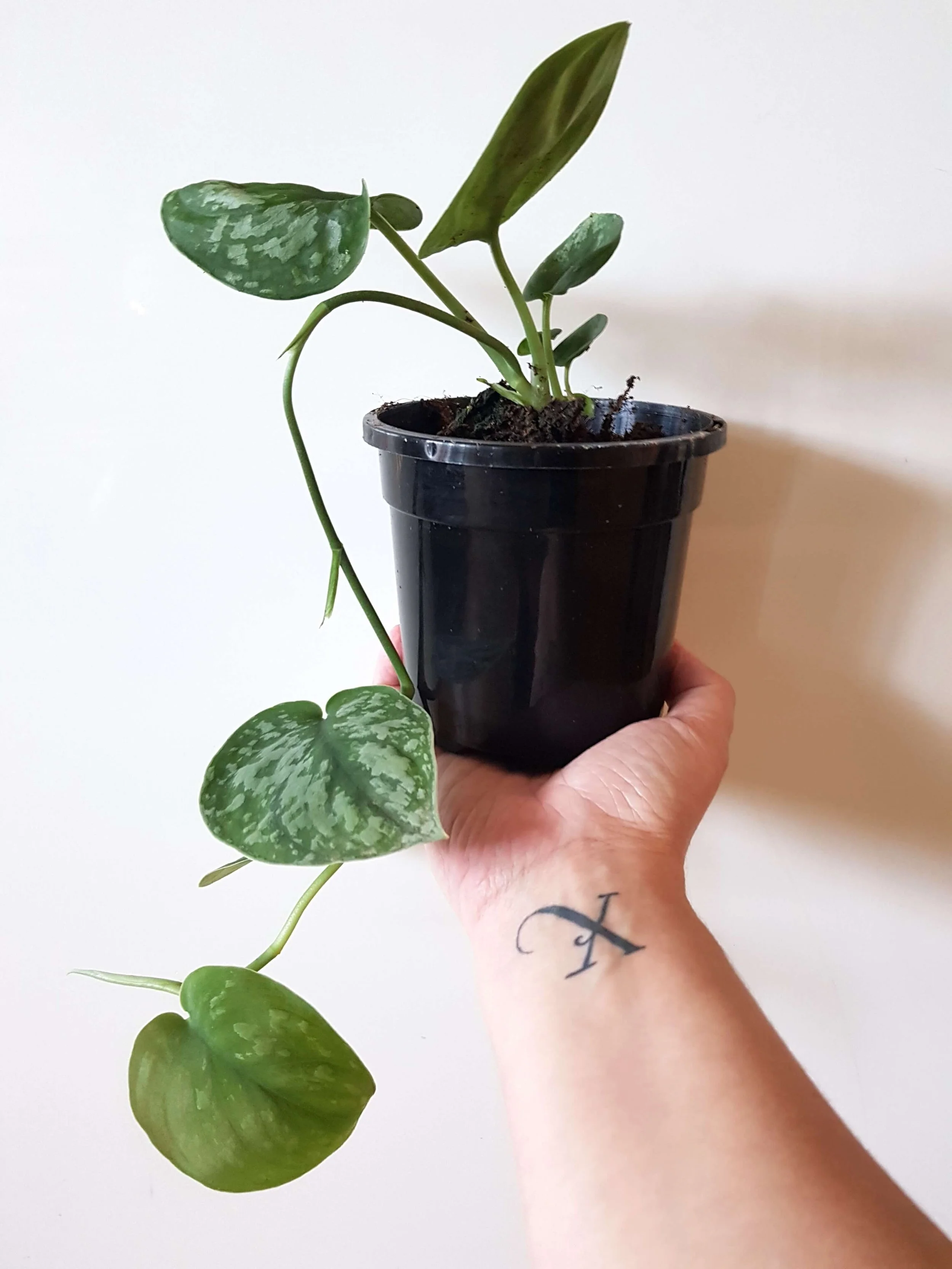 The Scindapsus Pictus (Exotica) is a hardy creeping vine plant that has a silver and green mottled leaf pattern. Silver amounts will vary with more in a brighter position. This plant will trail downward if hung or placed in a high spot or can be trained to climb and will stick to wall surfaces. New growth will continue to lengthen the plant and each leaf will have a different amount of patterning. This plant prefers an indoor position in bright light but out of direct sunlight and in damp to dry soil. Water this plant when the soil mostly drys out, soak and then leave to dry again. This plant is grown by Verdant Dwellings.