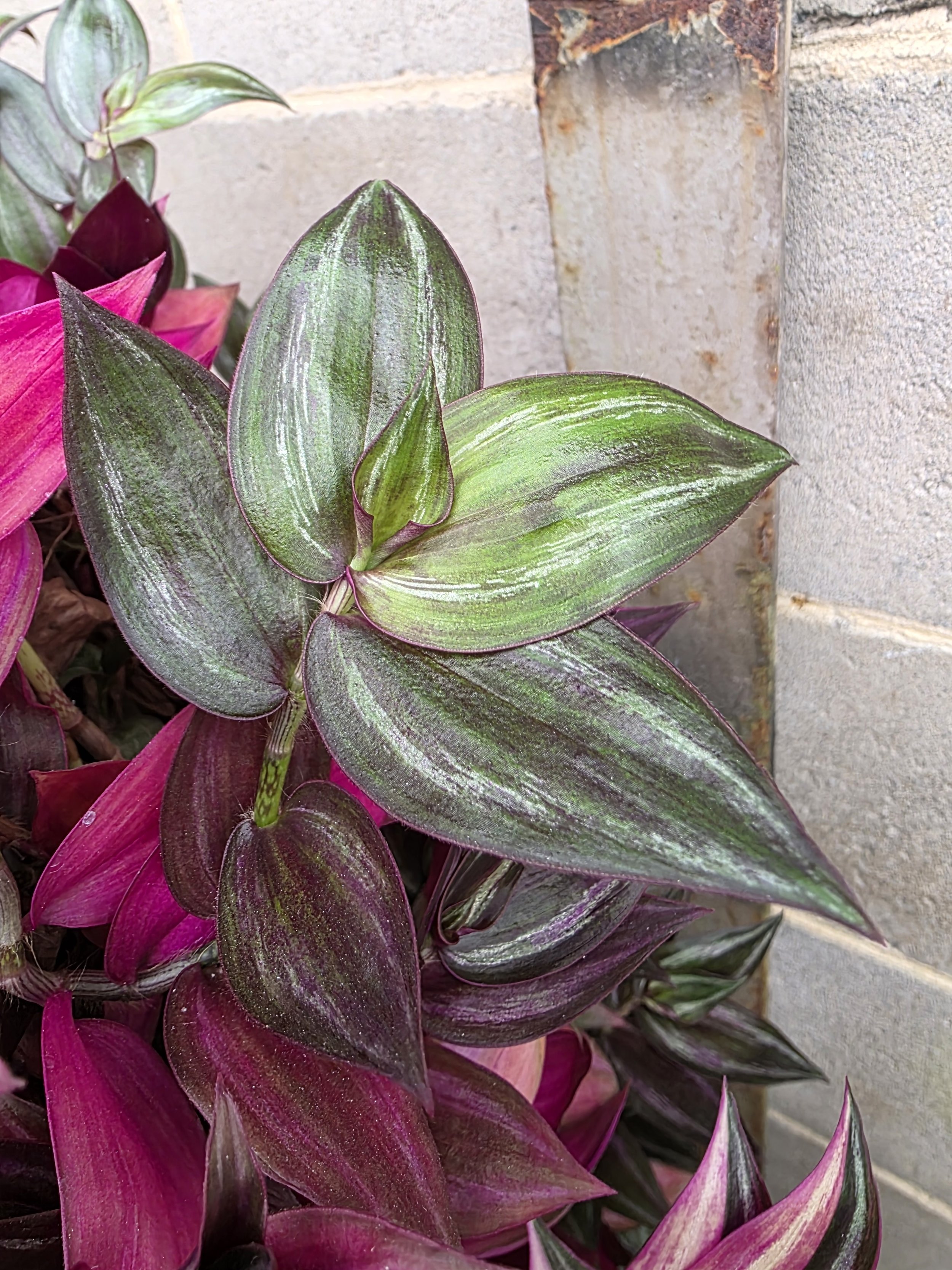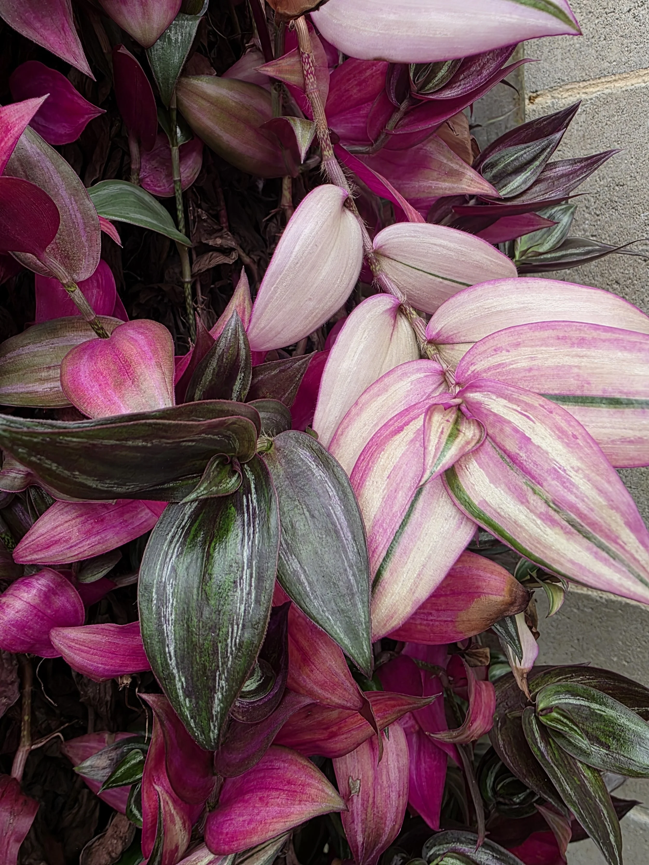 The Tradescantia Zebrina Variegated is an easy-growing plant that trails down shimmering green leaves with purple and cream variegation and a purple striped to full purple underside. Some plants will be more green with variegation in purple or cream, some more purple from a large amount of striped purple variegation and some with larger amounts of cream. See photos for examples. It is very easy care for and grow liking a bright position and does not like to be too wet. Broken stems can be put directly back into the pot to root and grow and pinching back greener leaves to allow variegated stems to proliferate will offer a more variegated plant. This plant is propagated and grown by Verdant Dwellings. VARIEGATION IS NOT STABLE, THEREFORE DIFFERS IN AMOUNT FROM PLANT TO PLANT AND IS NOT GUARANTEED IN FUTURE GROWTH.