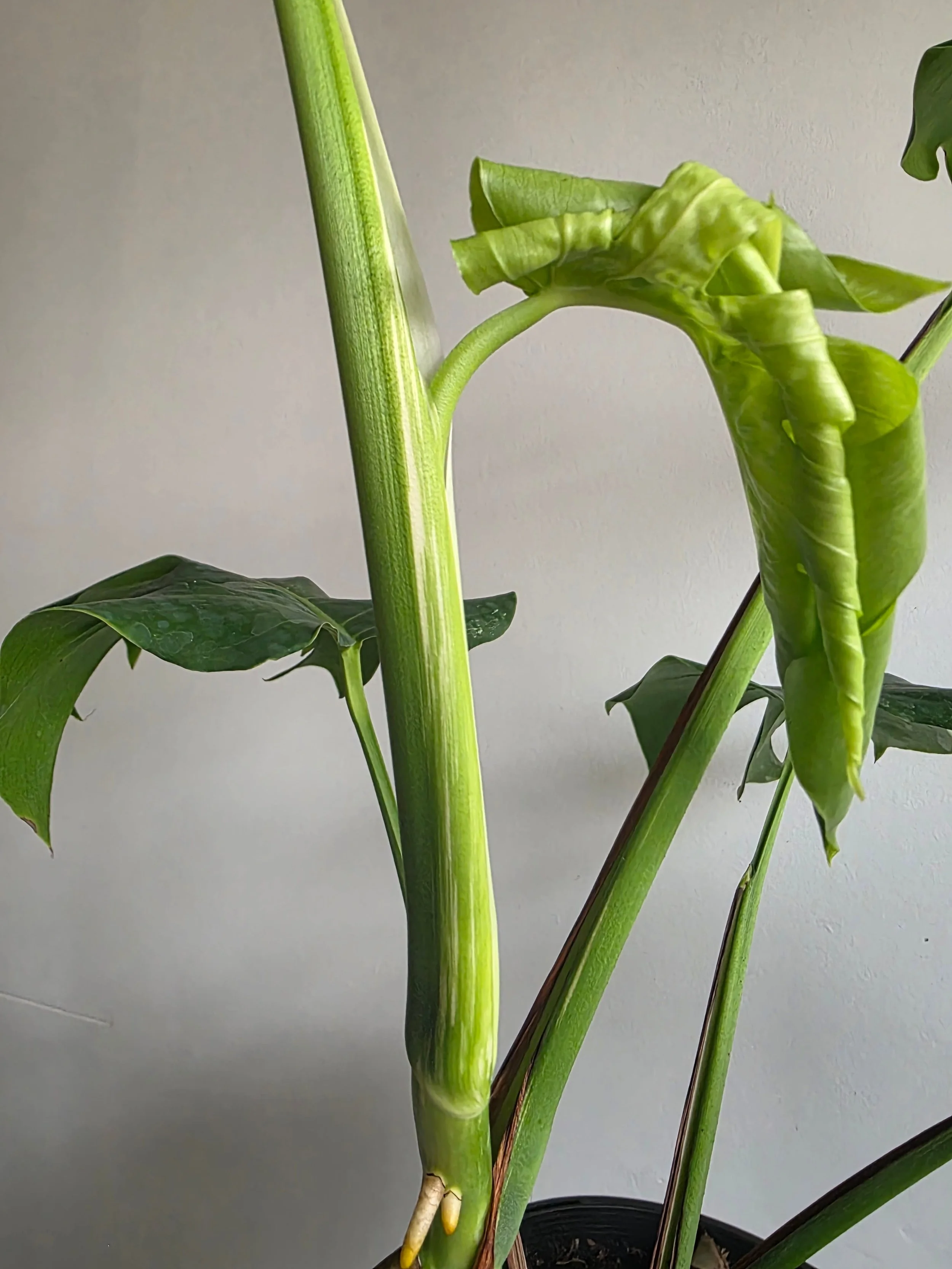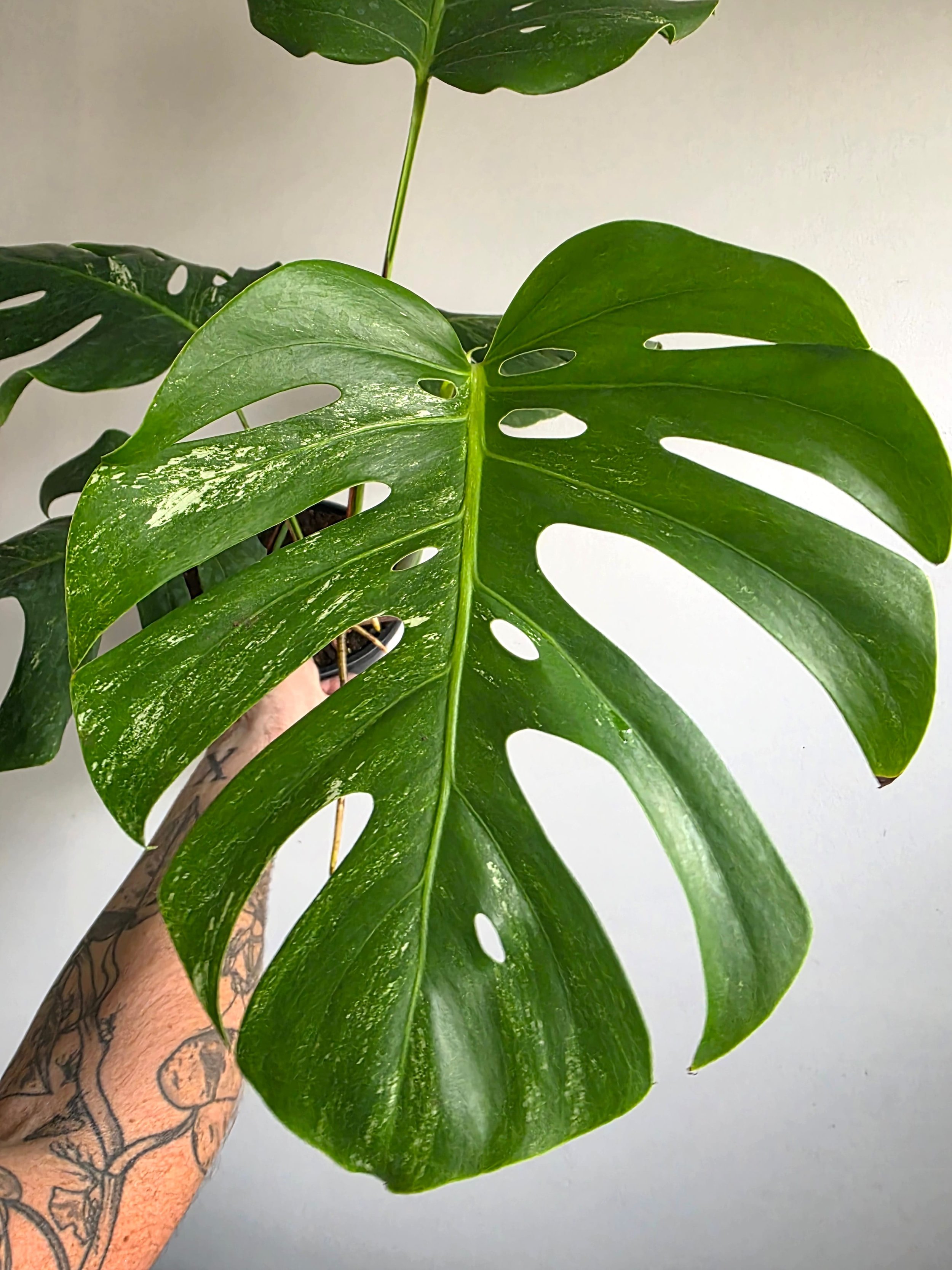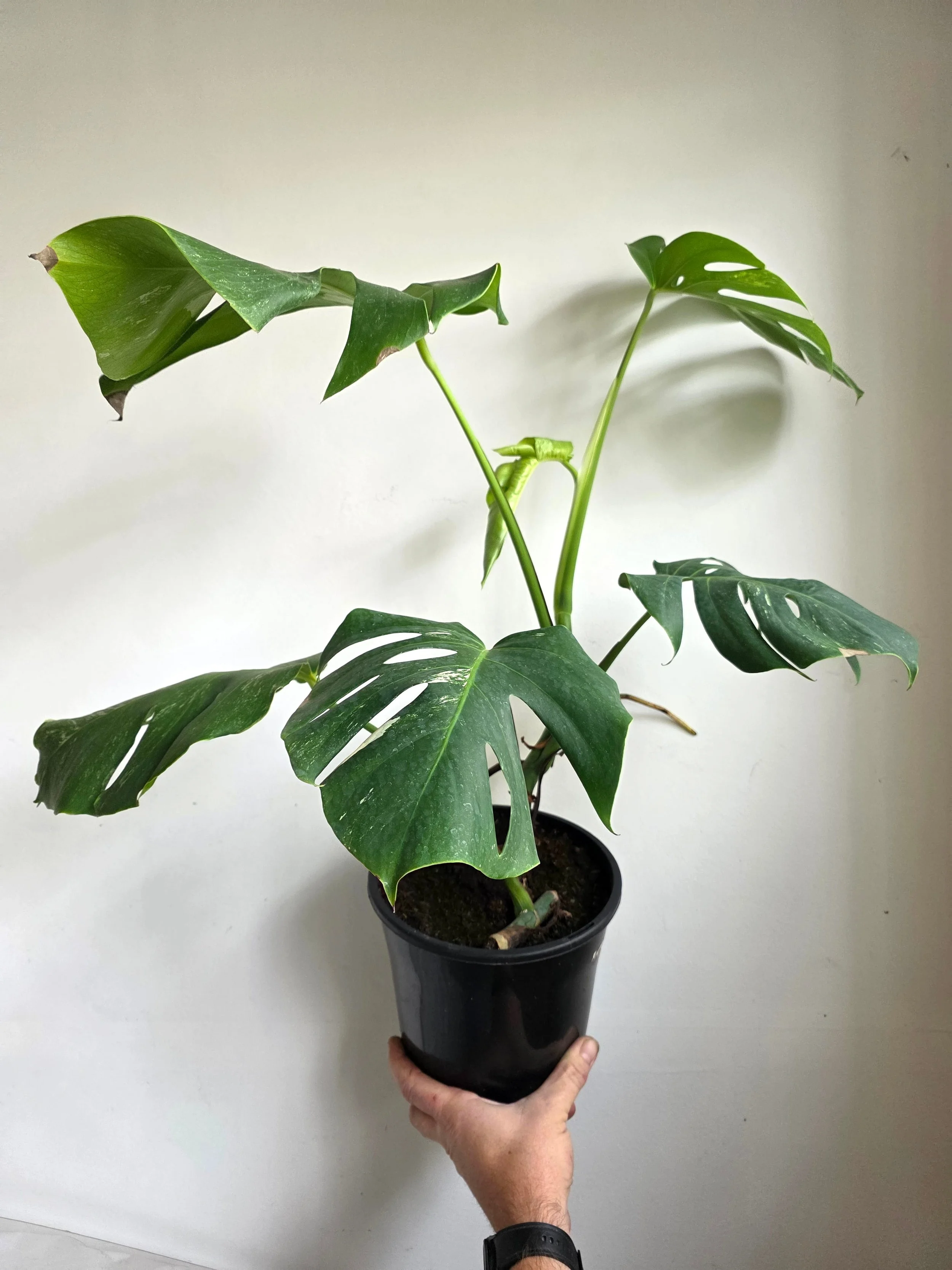 The Monstera Borsigiana Albo Variegata is a rare Small Form Monstera Deliciosa variety that does not grow leaves as large as the large form Deliciosa. Its variegation is also whiter as leaves harden off, is a more stable variegation, and as a plant is more prolifically variegated than a large form Deliciosa Albo. The Borsigiana is suited to an indoor position or a well-sheltered outdoor spot under a patio or veranda. It prefers very bright light or a non-harsh sun position and needs to dry out in the soil completely before another water. The white of the leaves is more delicate to the sun and is easily burnt in harsh sun, or will develop black patches if the light is too low. Position, therefore, needs to be taken into consideration. Propagated and grown by Verdant Dwellings. PLEASE NOTE: Fully rooted PLANT grown from side cutting. The ongoing level of variegation is unknown and cannot be guaranteed however, it is known to be stronger and more stable in the Borsigiana variety. Stem variegation present